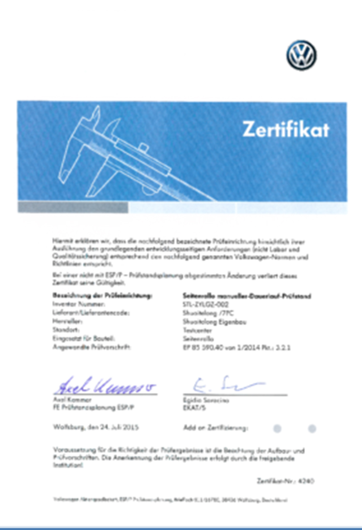 2014年獲得:德國VW實(shí)驗認可證書(shū)